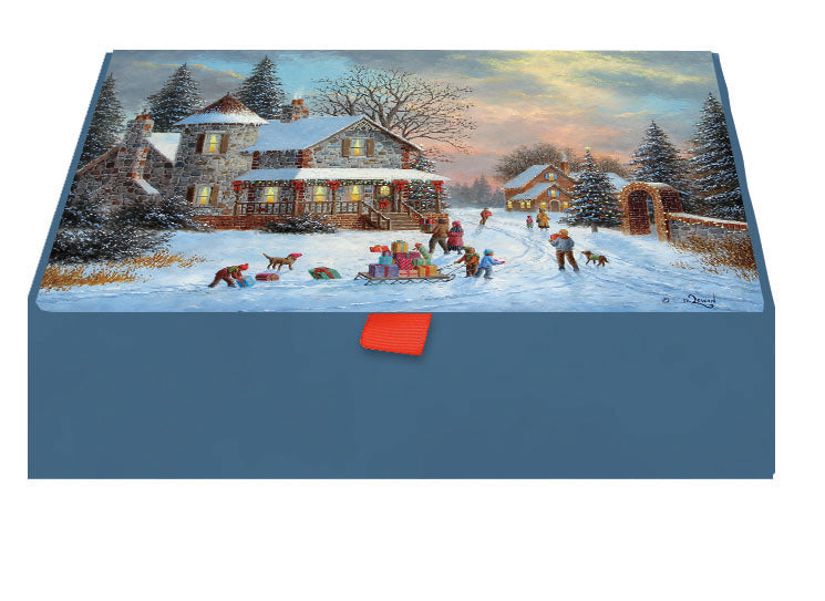 5" x 7" assorted holiday greeting cards.  There are 5 each of 4 designs in a reusable keepsake box with magnetic closure and ribbon tab.  All cards feature vibrant print and full color inside designs.  20 cards and 20 envelopes per box.