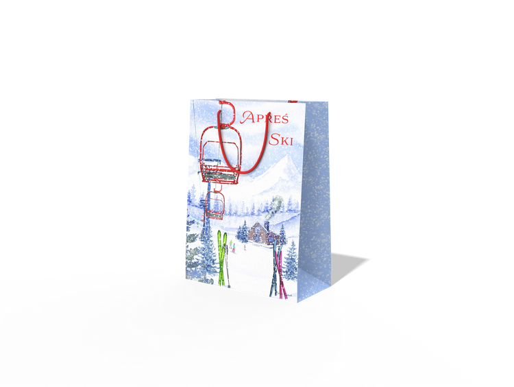 Après Ski gift bag featuring vintage-style artwork by Sharon Kuplak, showcasing classic red and green skis, a chairlift in the foreground, and a cozy ski cabin with snow-covered mountains beneath a light blue sky. Made in the USA. Size: 9" L × 4.5" W × 4.5" D.