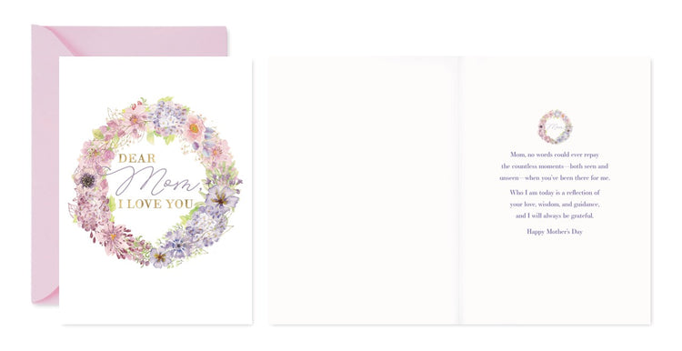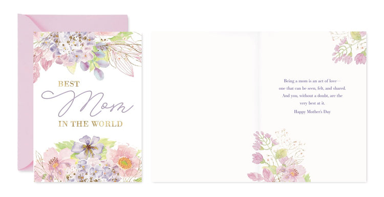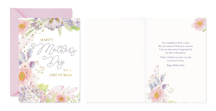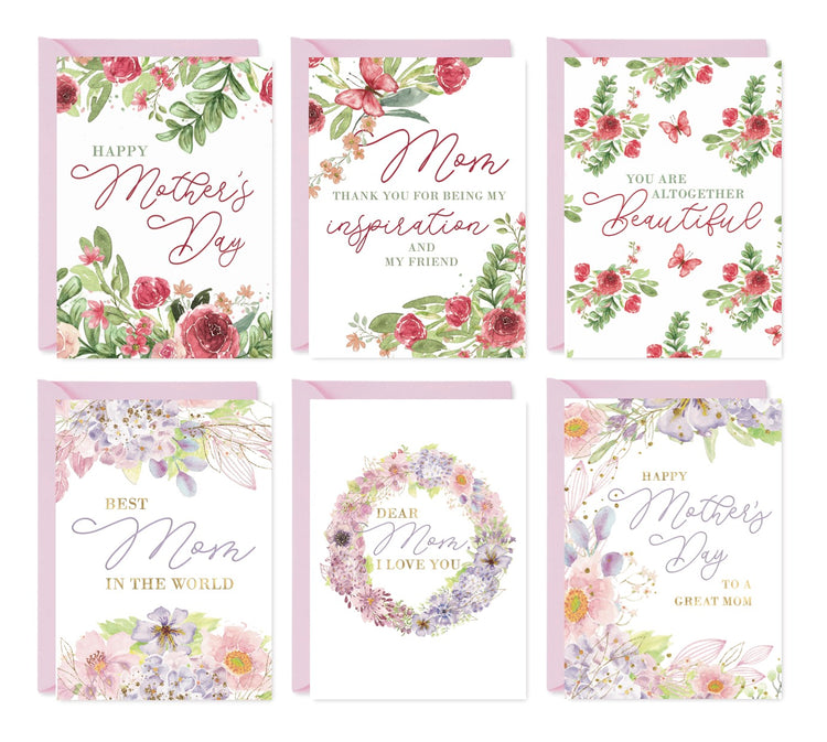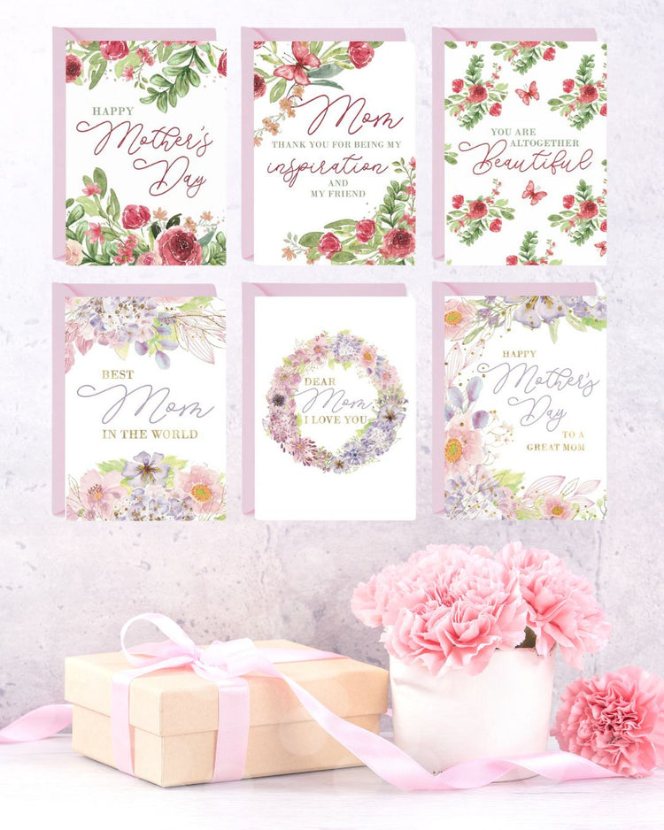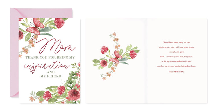 Each card features original floral artwork, printed on luxurious card stock with raised UV or foil details. With full-color interiors and blush pink envelopes, they’re made to feel as special as the moms they celebrate.