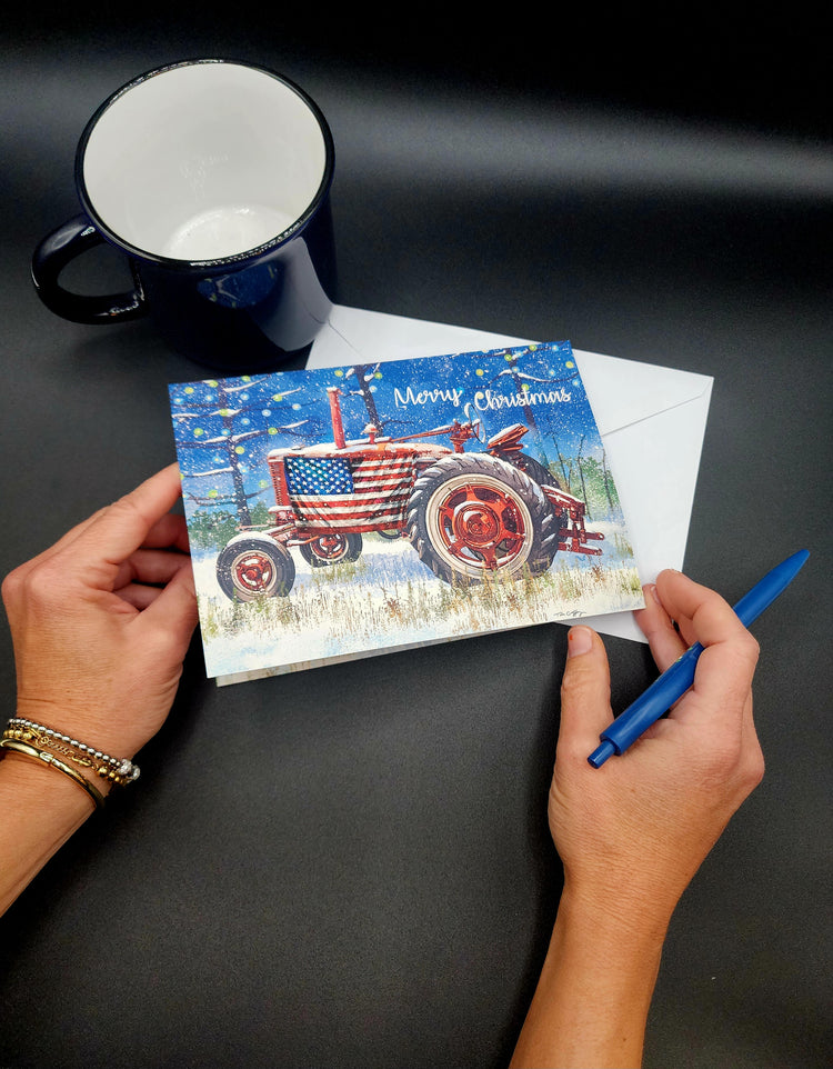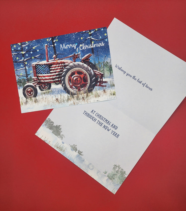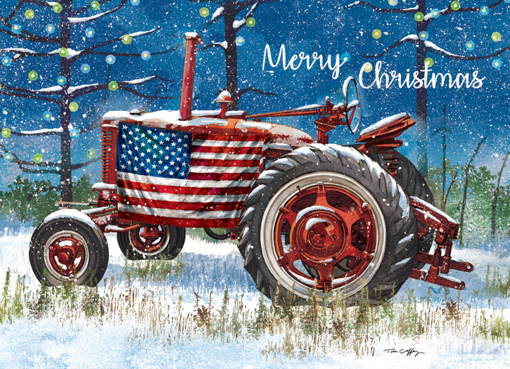 VINTAGE TRACTOR WITH FLAG by artist Tim Coffey. An old-school tractor adorning the American flag in a wonderous winter scene!