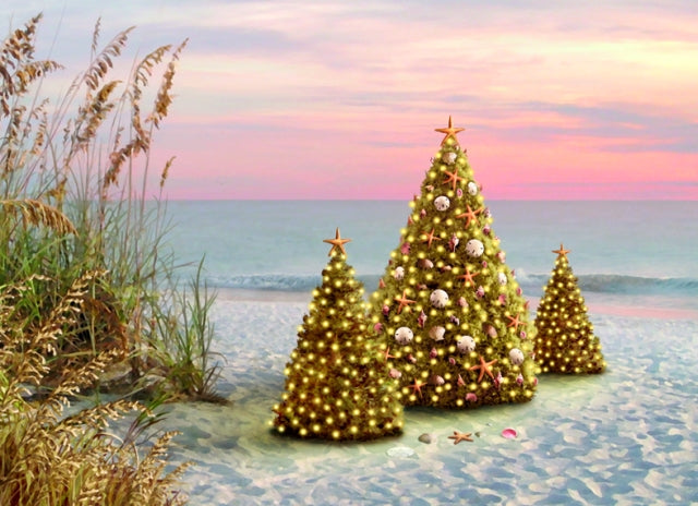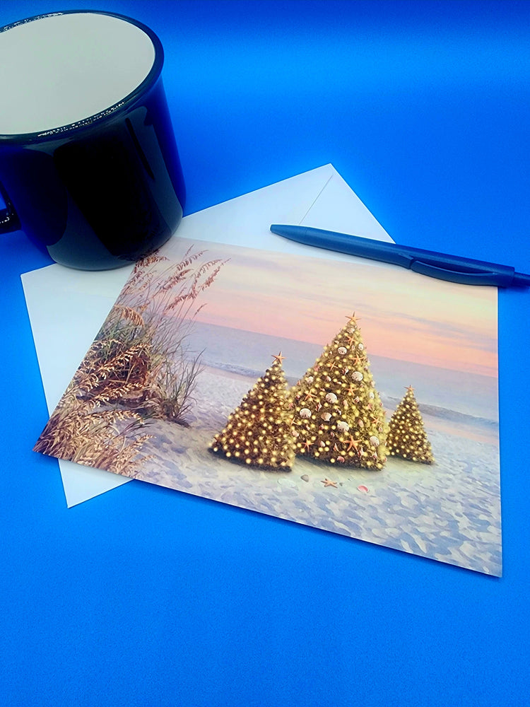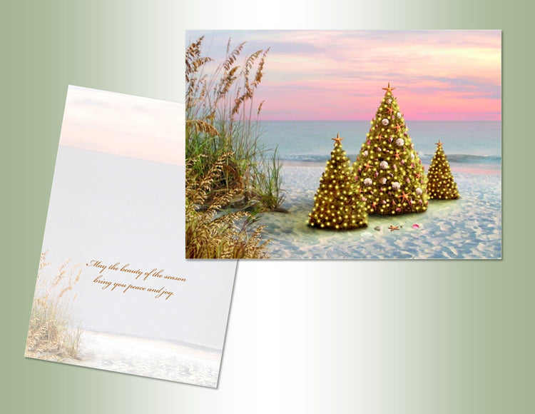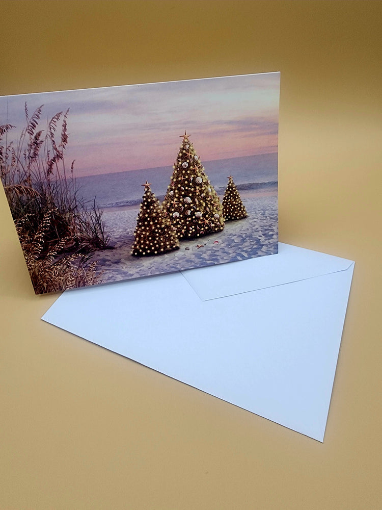 STUNNING BEACH CARDS by artist Alan Giana and Co. Three trees with white lights on a beach with a calm, subdued sunrise.