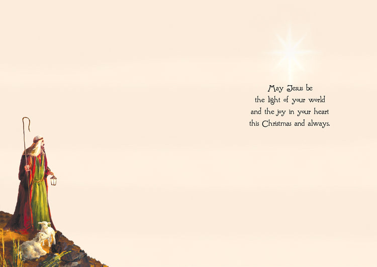 7.75" x 5.5" card with glitter embellishment and full color inside design.  14 cards and 14 envelopes per box. Nativity