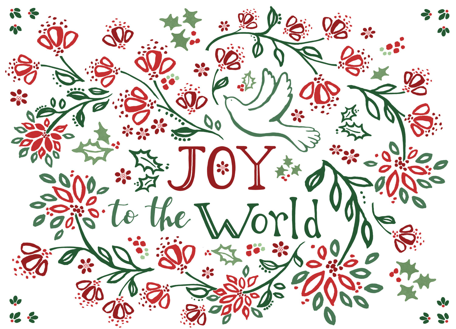 Graceful and uplifting, this elegant card features a white dove surrounded by flowing green vines and red flowers, creating a festive, floral motif in classic holiday colors illustrated by artist Rebecca Canale. With a soft-touch finish and a joyful message, itโs a timeless way to send heartfelt Christmas blessings.