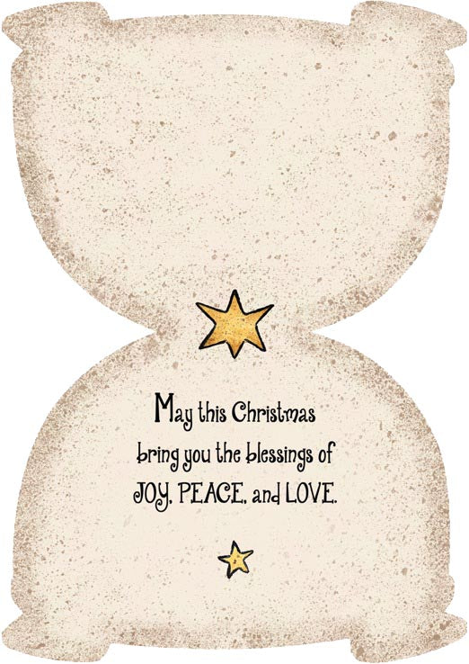 7" x 5" die-cut card with glitter embellishment on both front and back, full color inside and ribbon tie.  12 cards and 12 envelopes per box.