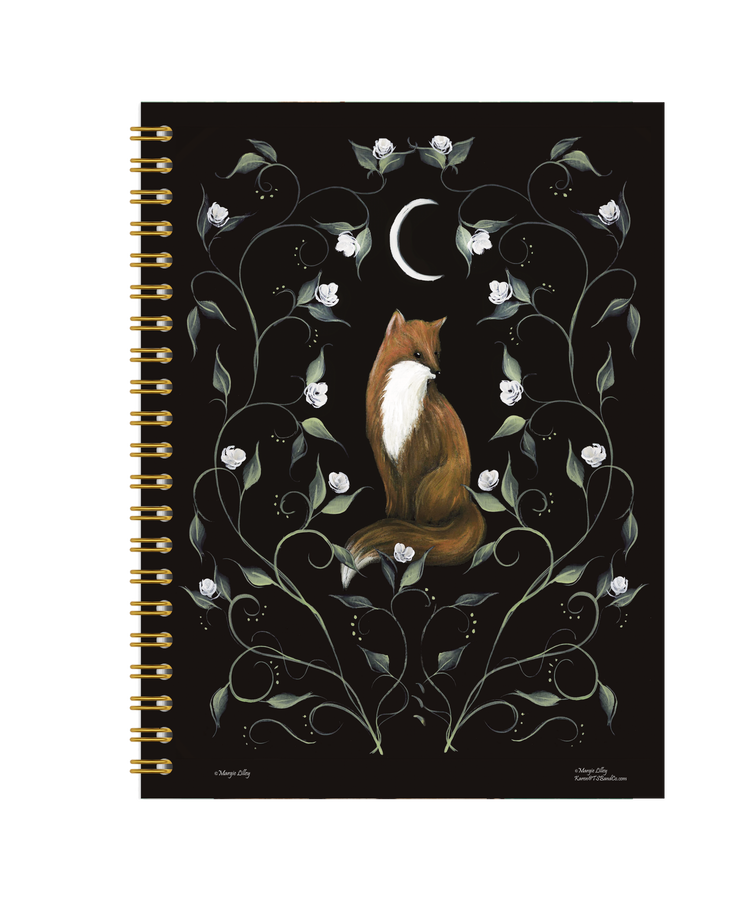 Let your creativity wander into a moonlit forest with this enchanting sketchbook featuring a painterly illustration of a fox gazing up at a silver moon, surrounded by soft white blooms. Created by artist Margie Lilley, this design feels like a quiet moment captured in nature—gentle, mysterious, and full of possibility.