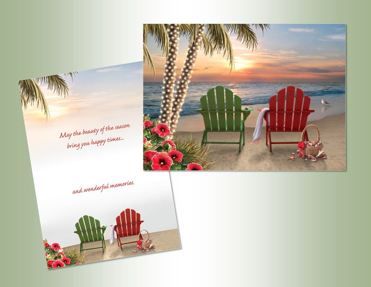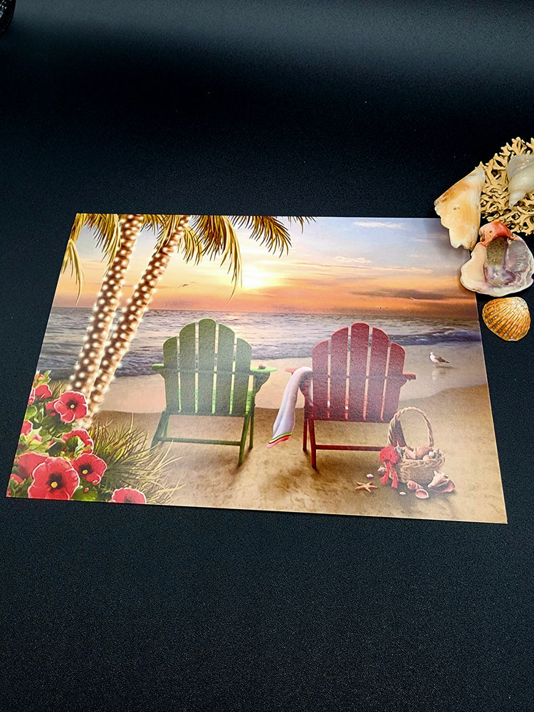STUNNING BEACH CARD by artist Alan Giana and Co. A pair of red and green beach chairs under the palm trees on a beach with a gorgeous sunset!