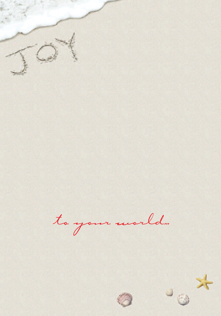 JOYFUL BEACH SCENE by artist Alan Giana and Co. A fun sand dollar snowman and the word JOY engraved in the sand with a white ocean wave!