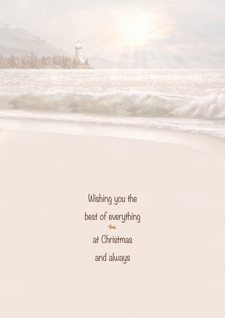STUNNING BEACH SUNRISE by artist Alan Giana and Co. A lovely Christmas tree on the ocean shore with a lighthouse and gorgeous sun rising!.
