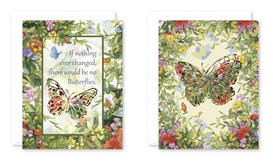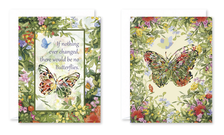Share a touch of nature’s wisdom and beauty with the Butterfly Inspiration Minis—a charming 20-pack of mini notecards featuring the gentle florals and graceful butterflies that define Sherri Buck Baldwin’s beloved artwork. Each card captures the soft, uplifting style seen throughout her collection, with two beautifully coordinated designs that celebrate growth, transformation, and the quiet magic found in nature.