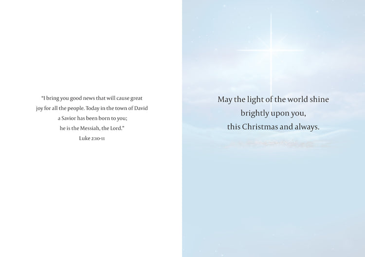 BIBLE VERSE INSIDE from Luke reads, "May the light of the world shine brightly upon you, this Christmas and always."